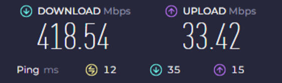 Internet WiFi. 418.54 Mbps download, 33.42 Mbps upload (Wired)